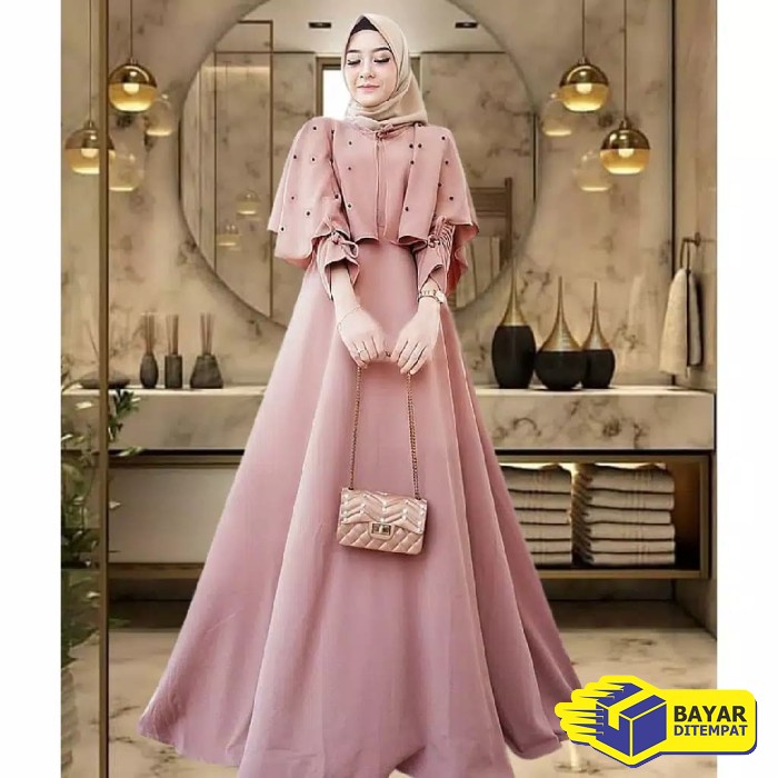 Selain brokat, gamis satin juga seringkali dikombinasikan dengan bahan beludru atau velvet yang elegan.